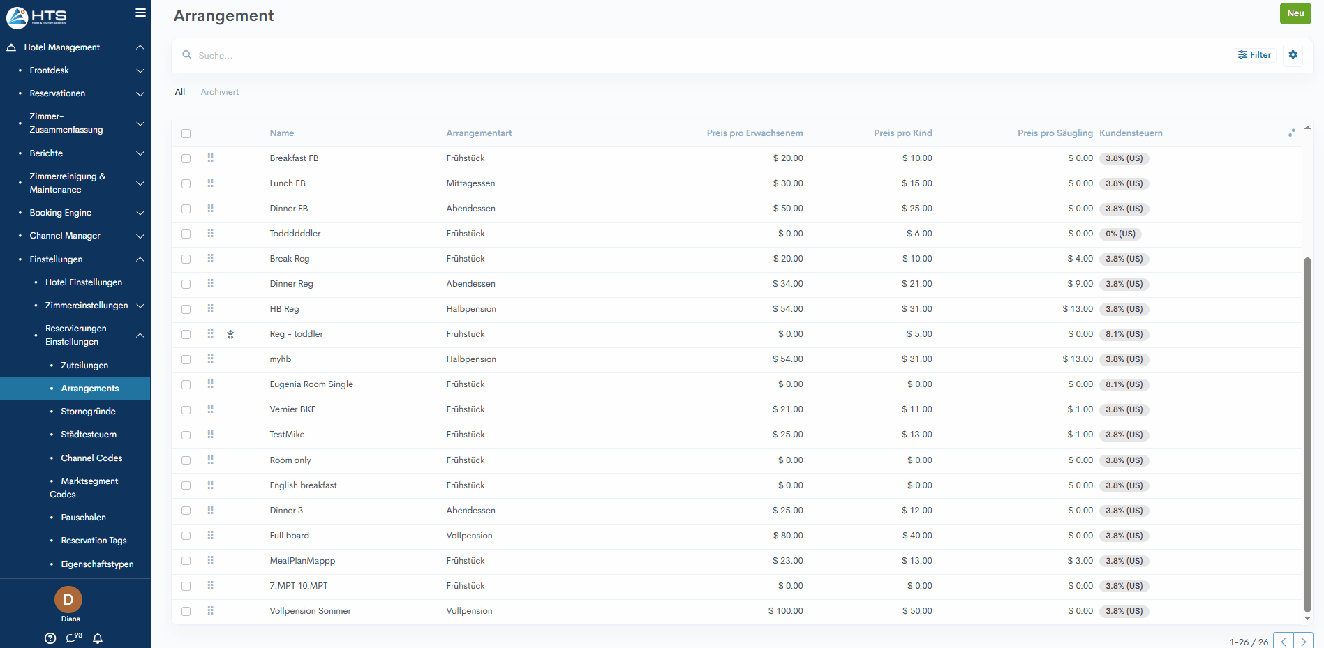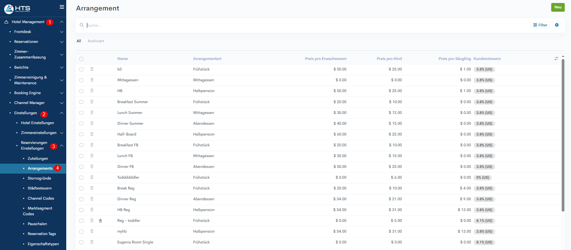 1. Arrangement-Typ - das System verfügt über drei Standard-Arrangementtypen - „Frühstück“, „Mittagessen“ und „Abendessen“ - und zwei Kombinations-Arrangementtypen - „Halbpension“, die eine Kombination aus zwei der drei Standard-Arrangementtypen ist - „Frühstück+Mittagessen“, „Frühstück+Abendessen“ und „Mittagessen+Abendessen“ - und „Vollpension“, die eine Kombination aus allen drei Standard-Arrangementtypen ist - „Frühstück+Mittagessen+Abendessen“.