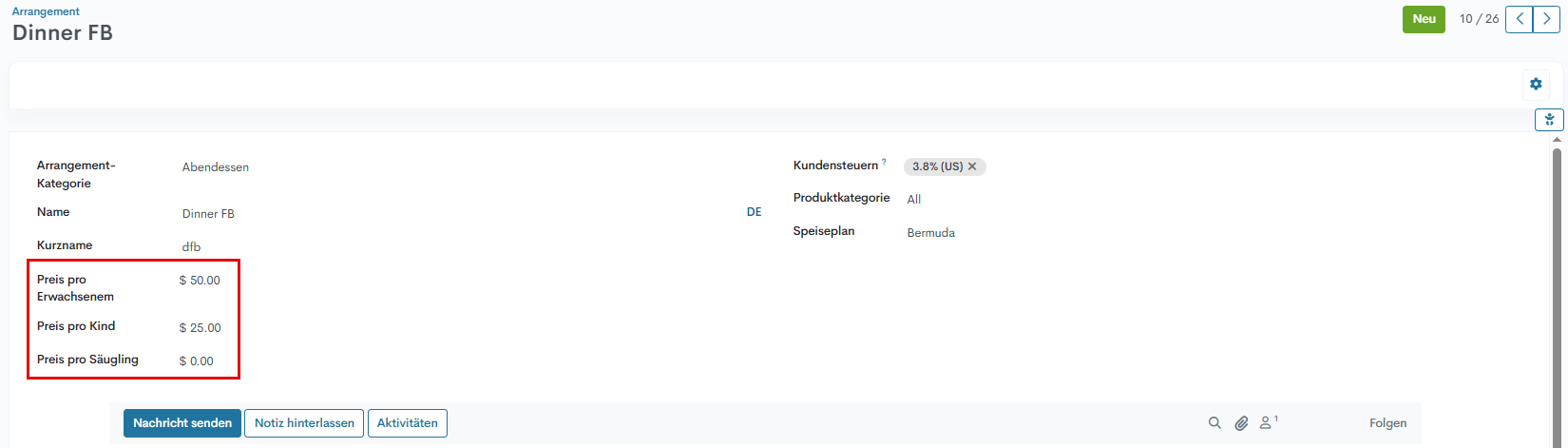Sobald die Art des Arrangements als „Frühstück“, „Mittagessen“ oder „Abendessen“ im ersten Schritt ausgewählt wurde, besteht die nächste Aufgabe darin, Preise jeder Alterskategorie zuzuweisen - „Preis pro Erwachsenem“, „Preis pro Kind“ und „Preis pro Kleinkind“.