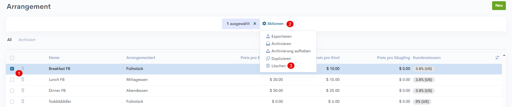 1. um ein bestehendes Arrangement zu löschen, klicken Sie auf das Kontrollfeld in der entsprechenden Zeile -> Aktionen -> Löschen;