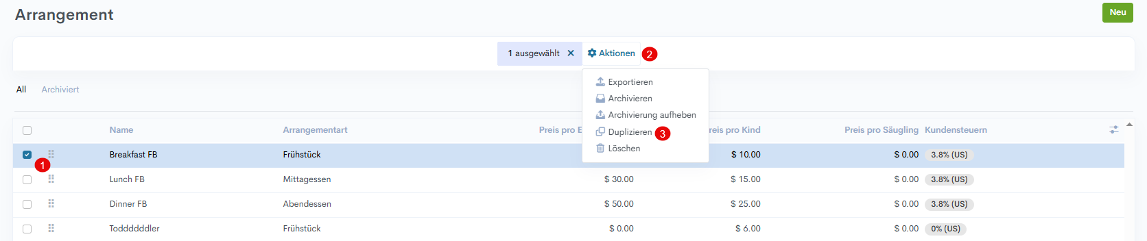 3. um ein bestehendes Arrangement zu duplizieren, klicken Sie auf das Kontrollfeld in der entsprechenden Zeile -> Aktionen -> Duplizieren