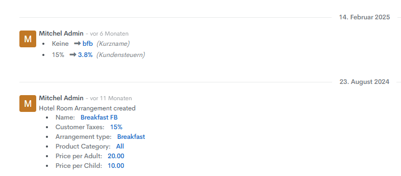 Alle Informationen zur Erstellung, Bearbeitung und Entfernung werden in einem Veränderungsverlauf für jedes Arrangement-Produkt angezeigt.