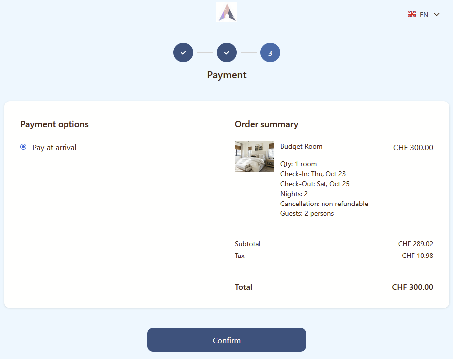On the left side, the 'Payment option' will be available — 'Pay at arrival'.
