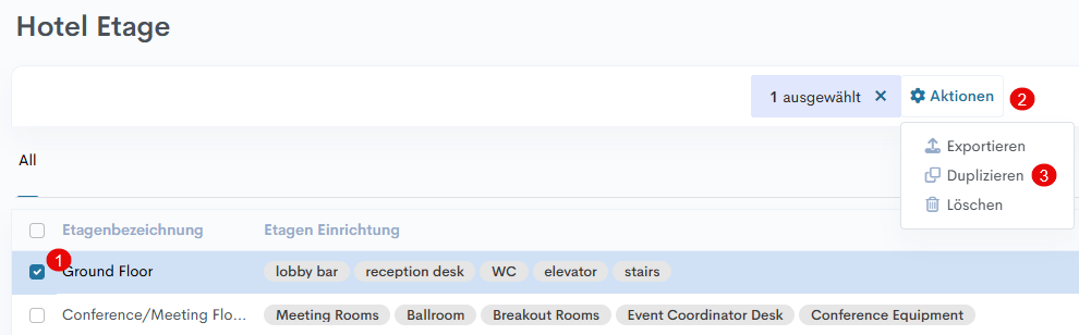 3. Um einen Eintrag zu vervielfältigen, klicken Sie auf das Kontrollfeld in der entsprechenden Zeile -> Aktionen -> Duplizieren.