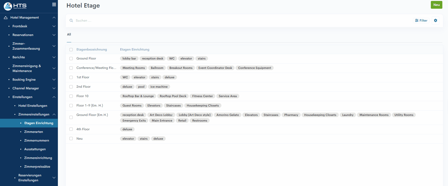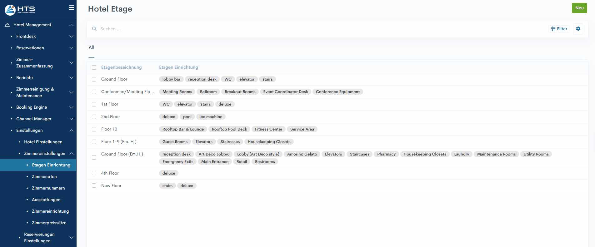 Wenn ein neues Fenster geöffnet wird, wird eine Zusammenfassung der vorhandenen Etagen zusammen mit einer Liste der in jeder Etage verfügbaren Gegenstände angezeigt. Es gibt auch die Möglichkeit, neue Etagen zu erstellen - Klicken Sie auf die Option "Neu" in der oberen linken Ecke: