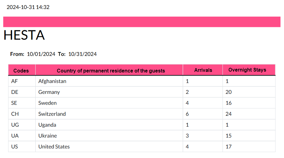 Der HESTA-Bericht (HESTA steht für "Harmonized European Social Taxation Assessment" oder "Beherbergungsstatistik" auf Deutsch) wird auf nationaler Ebene für 6000 Hotels, Gesundheitseinrichtungen und Campingplätze erstellt. Sein Zweck ist es, Daten über die Anzahl der Betriebe, Zimmer und Betten sowie Daten über Ankünfte und Übernachtungen nach dem Wohnsitzland der Besucher zu sammeln.
