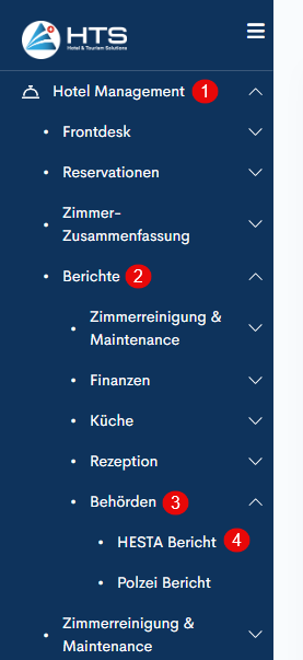 Alle Hotelberichte sind auf der Registerkarte "Berichte" im Modul "Hotel Management" verfügbar. Diese Berichte sind in verschiedene Abschnitte unterteilt - Küchenberichte, Front Office, Finanzen, etc. Um einen HESTA-Bericht zu erstellen, gehen Sie folgendermaßen vor: