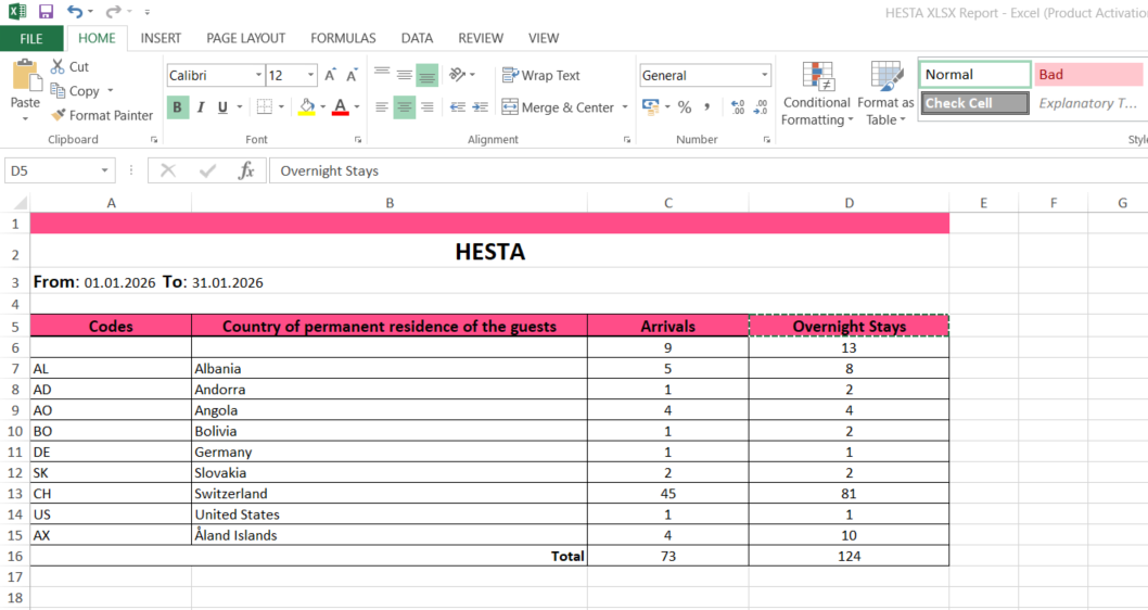 Am unteren Ende der Tabelle werden die Gesamtsummen für Ankünfte und Übernachtungen berechnet.