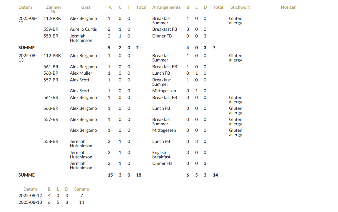 Am Ende jedes Tages wird in einer Zeile „SUM“ die Gesamtzahl der Gäste (A/C/I) und Mahlzeitenarten (B/L/D) zusammengefasst. Darüber hinaus wird am Ende des Berichts eine Übersichtstabelle für den gesamten Berichtszeitraum angezeigt.