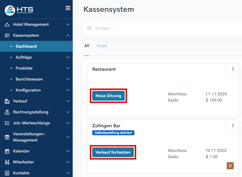 - Wählen Sie dort das Kassensystem aus, in dem die vorherige Konfiguration vorgenommen wurde, und klicken Sie entweder auf «Verkauf fortsetzen», wenn bereits eine Sitzung geöffnet ist, oder auf «Neue Sitzung», um eine neue zu starten.