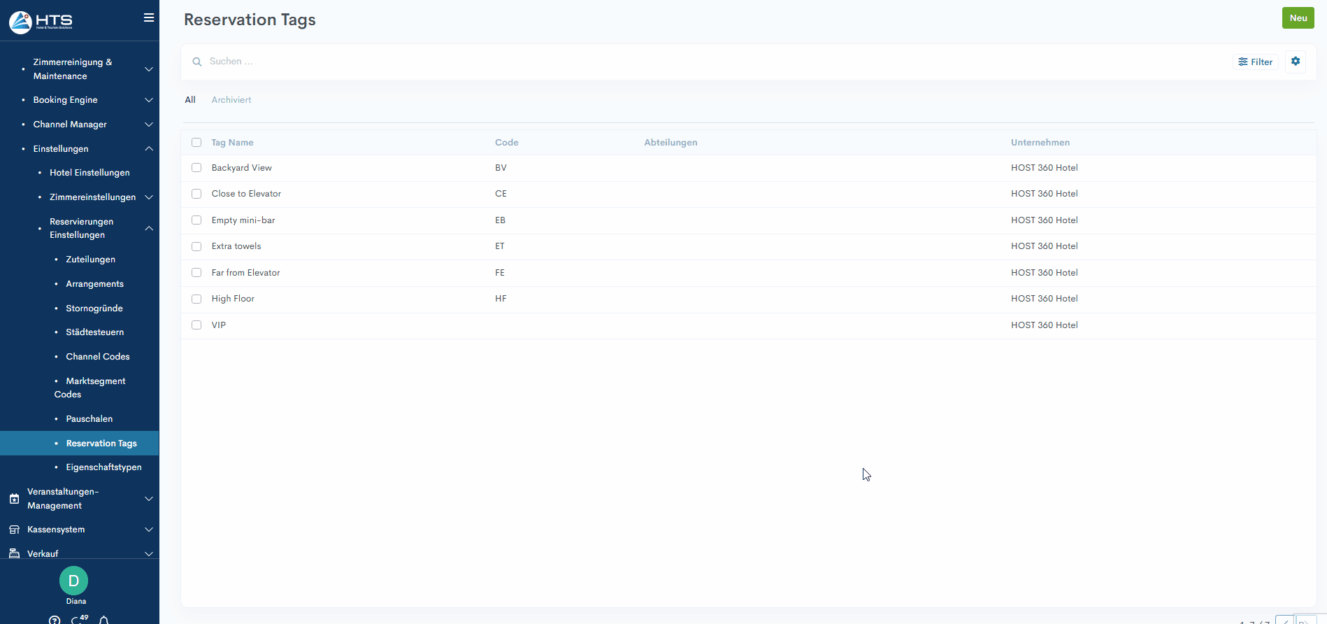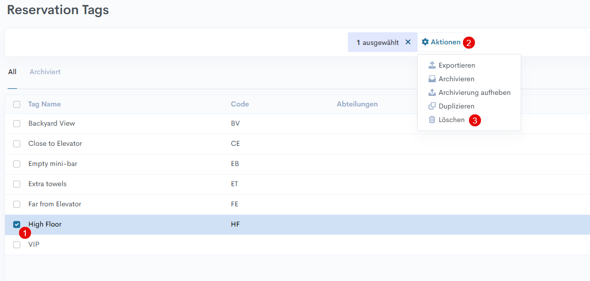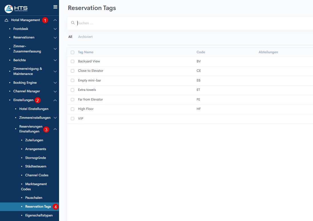 4. For Beispiel: Wenn das Schlagwort „extra Handtuch“ mit der Abteilung „Housekeeping“ zur Reservation hinzugefügt wird, wird es im HSK-Bericht angezeigt.