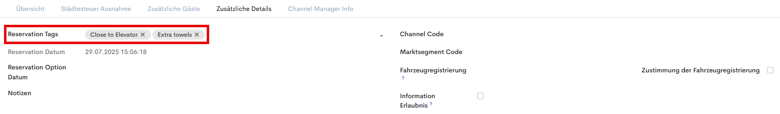 Auf der Reservationsseite befindet sich dieses Feld im Abschnitt „Zusätzliche Details“ - der User kann ein bestehendes Schlagwort aus der Liste auswählen oder direkt bei der Erstellung einer Reservation ein neues anlegen.