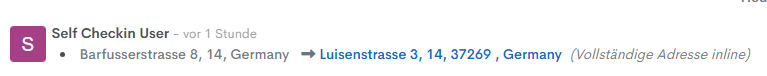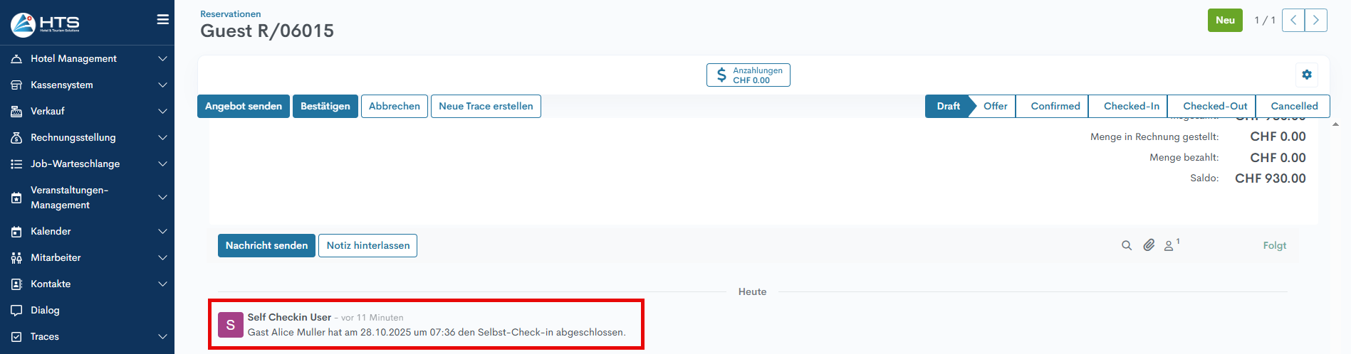 Diese Aktion wird auch im Chatverlauf der Reservation am unteren Rand der Seite protokolliert, einschliesslich des Zeitstempels, wann sie abgeschlossen wurde.
