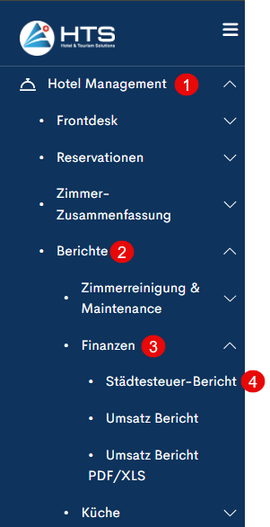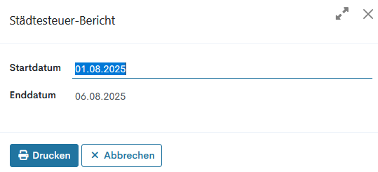 Darüber hinaus muss das Hotel den insgesamt erhobenen Betrag der Städtesteuer sowie alle in diesem Zeitraum angewendeten Ausnahmen nachverfolgen. Diese Informationen können durch das Erstellen eines Städtesteuer-Bericht abgerufen werden.