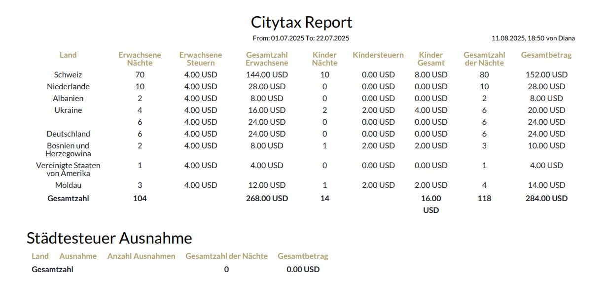 1. Citytax – in diesem Abschnitt gruppiert das System alle Gäste nach Ländern, die im definierten Zeitraum im Hotel übernachtet haben.
