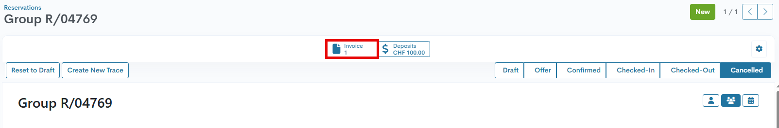 Wenn die Gruppenbuchung aus irgendeinem Grund storniert wurde, hat der Benutzer die Möglichkeit, diese Reservation wiederherzustellen - auf der Seite dieser Reservation wird die Schaltfläche „Auf Bestätigt zurücksetzen“ verfügbar sein. Nach dem Drücken dieser Schaltfläche wird der Status der Reservation und aller damit verbundenen Gäste-Reservationen auf „Bestätigt“ geändert und die Storno-Rechnung (falls noch nicht bezahlt) wird storniert.
