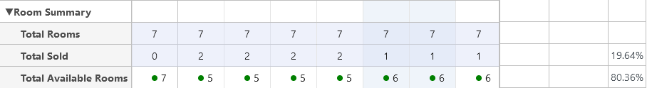 - Zimmer Zusammenfassung - Abschnitt enthält Informationen über die Gesamtzahl der Zimmer im Hotel im Gesamtzahl Zimmer Feld, die Gesamtzahl der verkauften Zimmer für jedes der Daten im Insgesamt verkauft Feld, und dem Verfügbare Zimmer insgesamt Feld, berechnet das System die durchschnittlichen Belegungswerte;