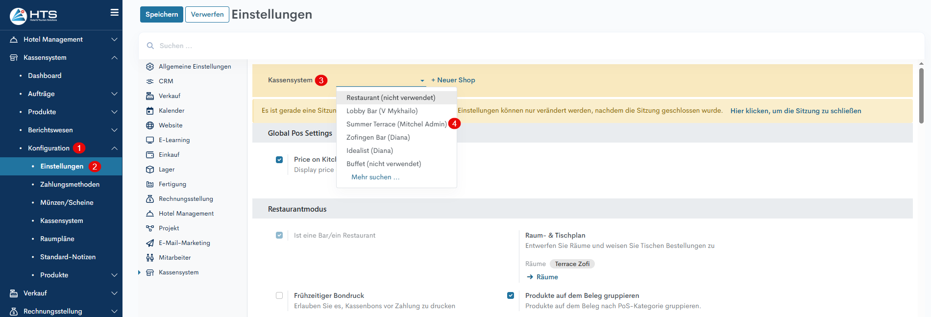 Wählen Sie dort das Kassensystem aus, in dem die vorherige Konfiguration vorgenommen wurde, und klicken Sie entweder auf «Verkauf fortsetzen», wenn bereits eine Sitzung geöffnet ist, oder auf «Neue Sitzung», um eine neue zu starten.