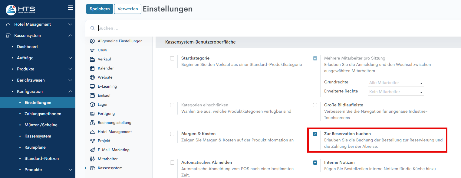 Aktivieren Sie im Abschnitt «Kassensystem-Benutzeroberfläche» das Kontrollkästchen neben «Zur Reservation buchen».