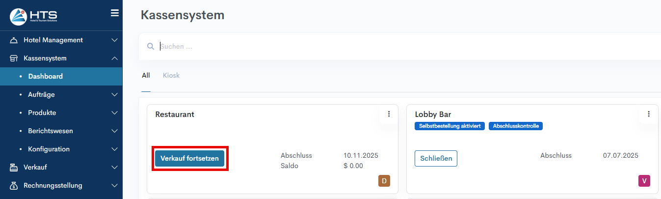 - Klicken Sie im Modul «Kassensystem» auf den Tab «Dashboard».
