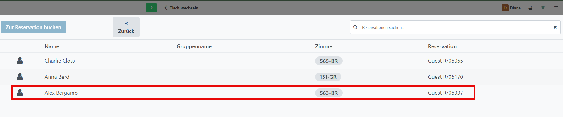 - Suchen und öffnen Sie die im Kassensystem gebuchte Reservation über die Suchleiste – die Suche funktioniert auch nach Gastname, Reservationsnummer oder Zimmernummer.