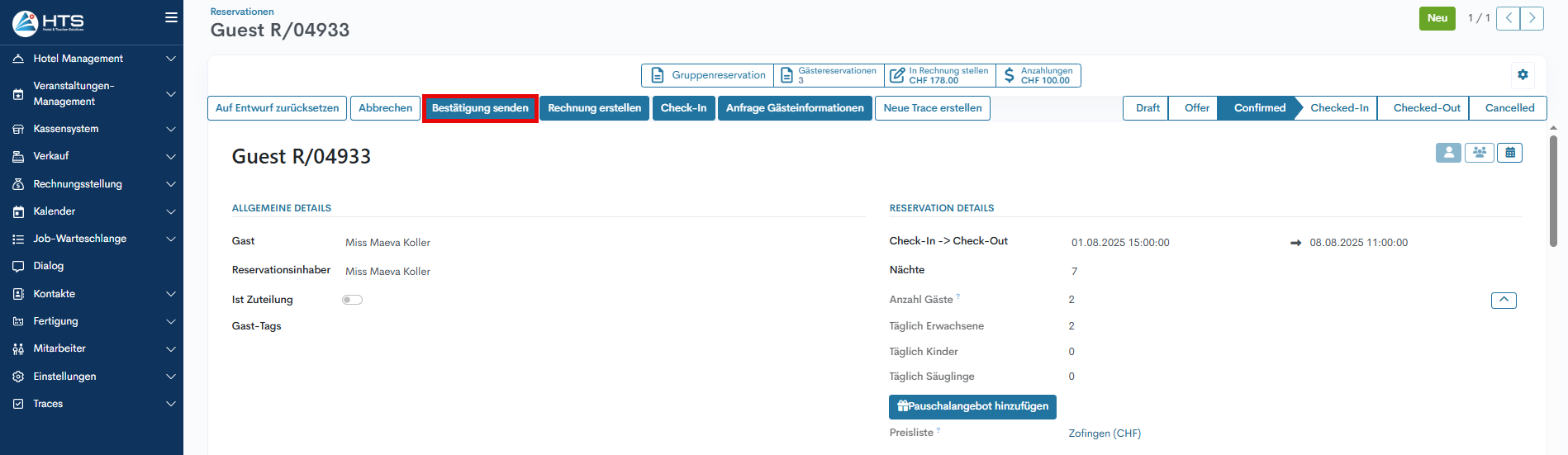 Nachdem eine Reservierung bestätigt wurde, ermöglicht das System dem Benutzer, eine Bestätigungs-E-Mail zu senden, die alle wichtigen Details zur Reservierung enthält, einschließlich Daten, Gästeanzahl, Preisgestaltung und Zimmerdetails. Im Status „Bestätigt“ ist in der Schaltflächenleiste die Schaltfläche „Bestätigung senden“ verfügbar.