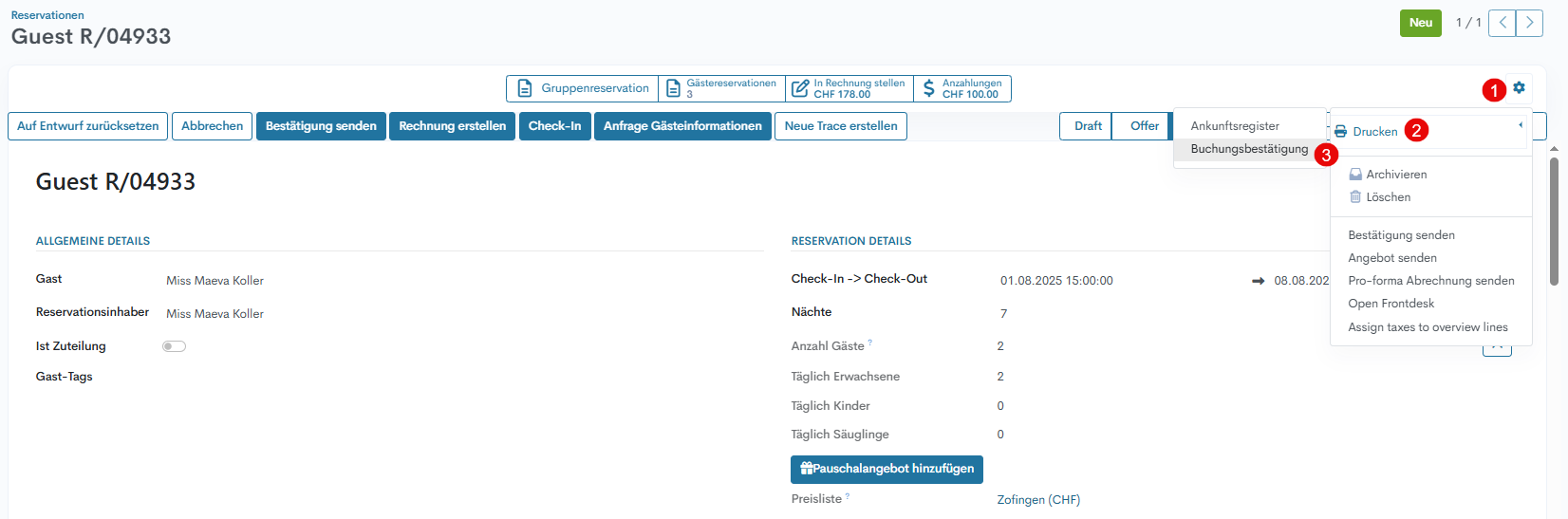 2.  Aktionen ‣ Drucken ‣ Buchungsbestätigung