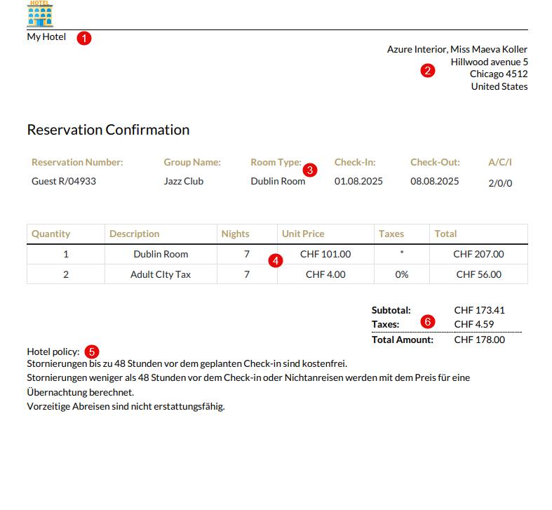 • Der Name und die Adresse des Gastes befinden sich in der rechten Ecke.