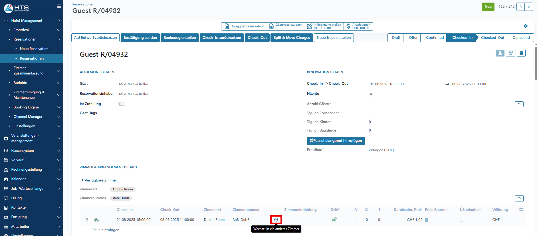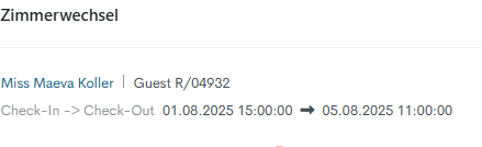 Wenn es notwendig wird, einen Gast von einem Zimmer in ein anderes zu verlegen (z. B. Upgrade, Lärm usw.), klicken Sie auf das Symbol „Wechsel in ein anderes Zimmer“ innerhalb der Hotelzimmerzeile, um den Prozess zu starten.