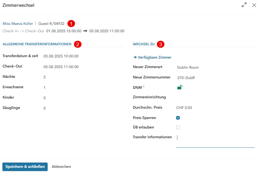 • Transferdatum & zeit – Legen Sie Datum und Uhrzeit fest, zu denen der Gast in ein anderes Zimmer umzieht.