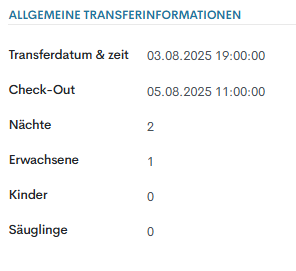 • Nächte – Anzahl der Nächte mit den neuen Daten. Wenn das Transferdatum festgelegt ist und die Anzahl der Nächte geändert wird, passt das System das Abreisedatum entsprechend an.