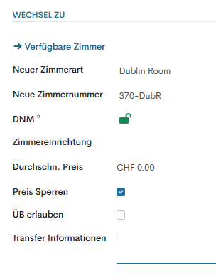 • Neue Zimmernummer - Wählen Sie aus dem Dropdown-Menü eine Zimmernummer aus, die zum oben ausgewählten Zimmertyp gehört.